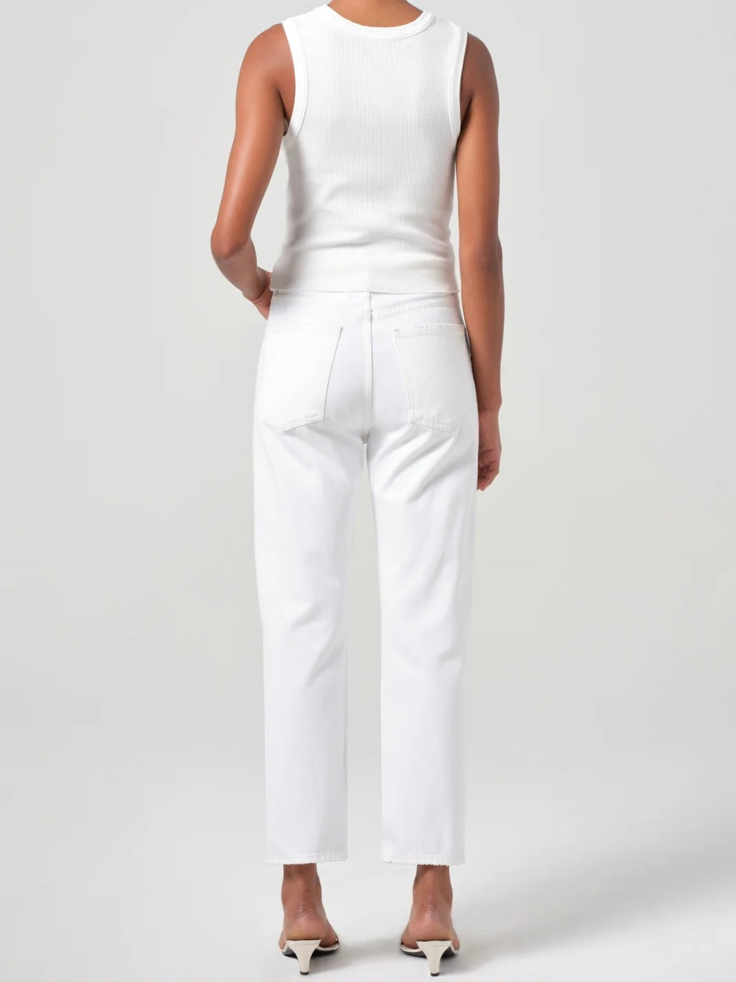 The 90’s Pinch Waist Crop offers a fresh take on a signature silhouette. Designed in a soft clean white wash, this high-rise straight-leg style features a cropped 27.5-inch inseam that feels timeless and modern. Crafted from non-stretch regenerative cotton denim with a soft hand feel, it delivers all day comfort while maintaining structure and polish. Pair it with a relaxed tee and leather slides for effortless ease, or elevate the look with a tailored blazer and minimal accessories.